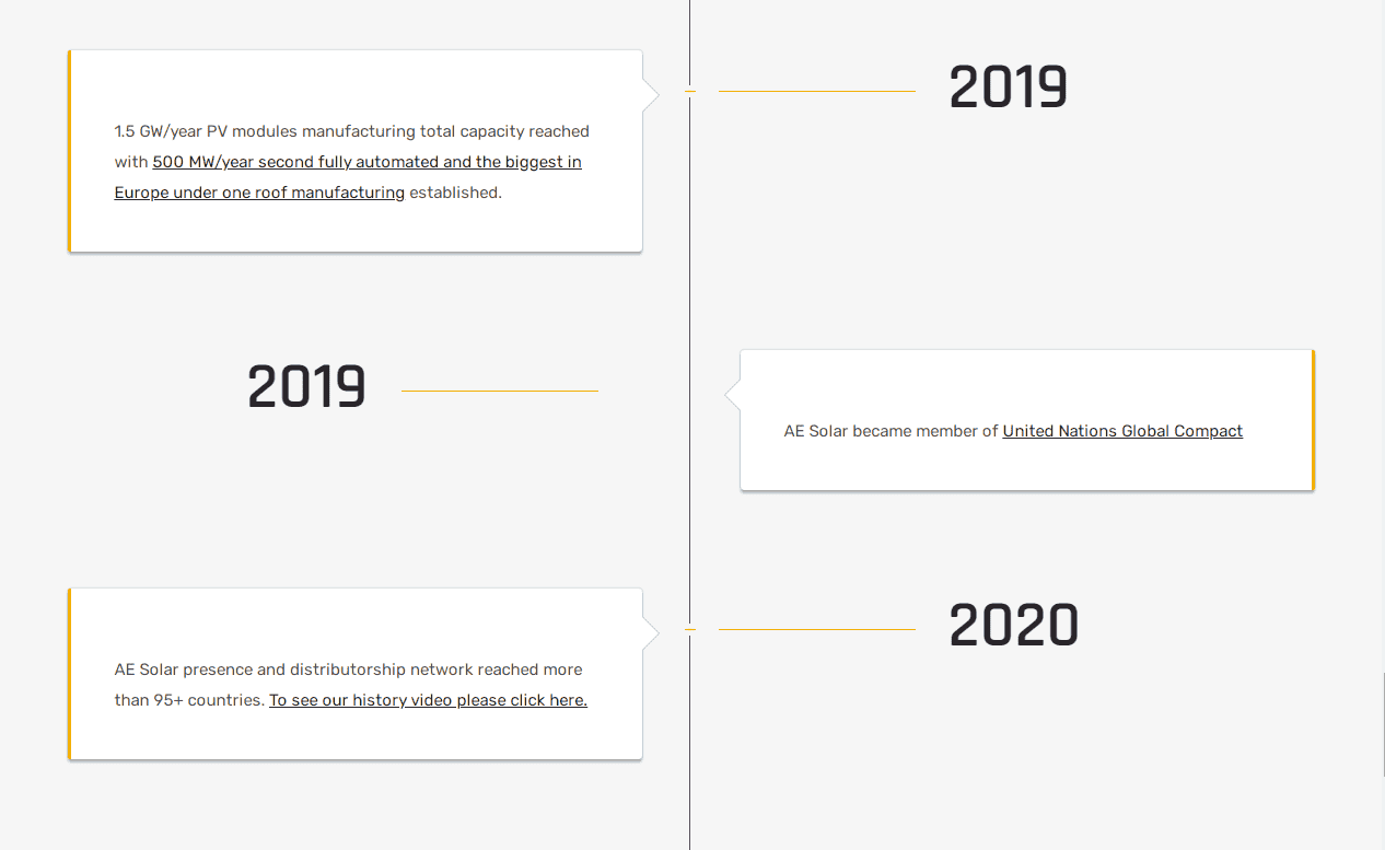 The company is a key component supplier and project developer. AE Solar’s global sales and marketing network successfully provides end-users with accessible clean energy, whilst promoting its core brand values of stability, durability, and reliability.