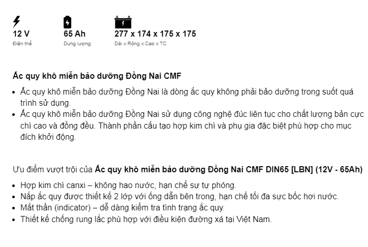 Dòng CMF là ắc quy miễn bảo dưỡng (ắc quy khô, kín) của Đồng Nai đảm bảo về chất lượng cũng như giá thành sản phẩm. Ắc quy làm từ hợp kim chì canxi có bổ sung thiếc, bạc nhập khẩu từ Úc nên không hao nước, hạn chế sự tự phóng điện. Nắp bình được thiết kế 2 lớp với ống dẫn bên trong, giúp giảm tối đa sự bốc hơi nước. Trong bình trang bị bộ phận lọc chống bắt lửa – an toàn khi sử dụng và Indicator (mắt thần) – dễ dàng kiểm tra tình trạng ắc quy.