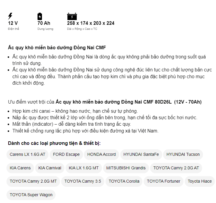 Dòng CMF là ắc quy miễn bảo dưỡng (ắc quy khô, kín) của Đồng Nai đảm bảo về chất lượng cũng như giá thành sản phẩm. Ắc quy làm từ hợp kim chì canxi có bổ sung thiếc, bạc nhập khẩu từ Úc nên không hao nước, hạn chế sự tự phóng điện. Nắp bình được thiết kế 2 lớp với ống dẫn bên trong, giúp giảm tối đa sự bốc hơi nước. Trong bình trang bị bộ phận lọc chống bắt lửa – an toàn khi sử dụng và Indicator (mắt thần) – dễ dàng kiểm tra tình trạng ắc quy.