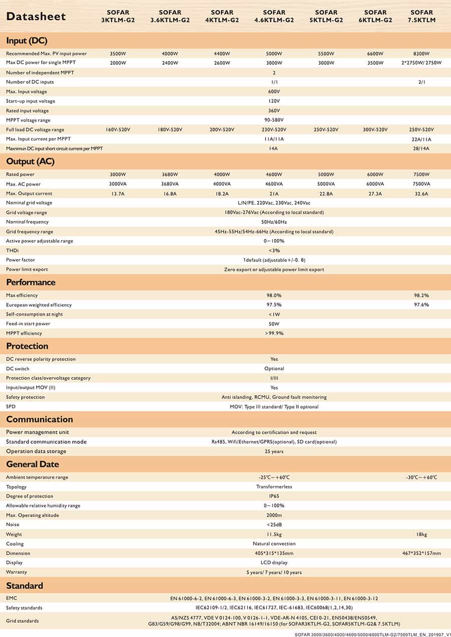 Thông số kỹ thuật INVERTER HÒA LƯỚI SOFAR SOLAR 5KW (5KTLM-G2)