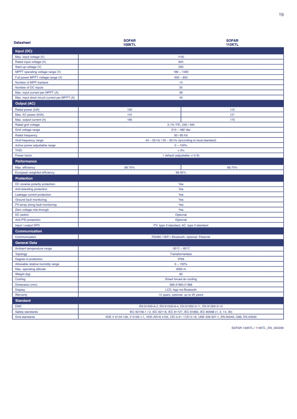 Thông số kỹ thuật INVERTER HÒA LƯỚI SOFAR SOLAR 100KW 3 PHA (110KTL)