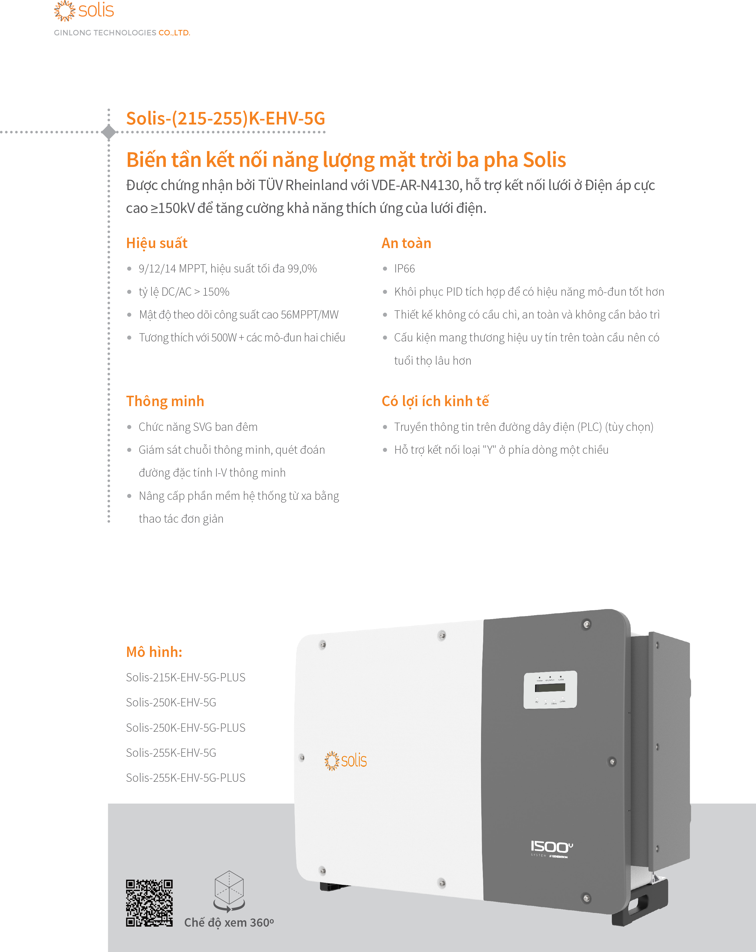 Biến tần chuỗi ba pha 215kW có đầu vào tối đa 28 chuỗi, hỗ trợ kết nối kiểu “Y” ở phía DC. Dòng đầu vào chuỗi tối đa 15A, hỗ trợ truy cập mô-đun hai mặt. Hỗ trợ chức năng chống PID để cải thiện hiệu quả của hệ thống. Giám sát chuỗi thông minh có độ chính xác cao giúp giảm thời gian xác định vị trí lỗi.