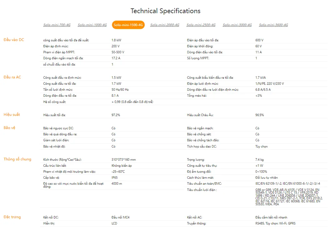 Dòng Inverter 1 Pha Solis-Mini là người dẫn đầu nguồn điện xanh trong các dự án điện mặt trời áp mái nhỏ cho nhà ở và thương mại, giá cả phải chăng. Áp dụng đủ các kĩ thuật điều khiển kĩ thuật số, có cấu trúc topo tiên tiến, và thuật toán MPPT chính xác, có hiệu suất cao hơn hiệu suất thiết bị các hãng dẫn đầu trong nghàng với hiệu suất tối đa 97.5%. Trong khi có tích hợp nhiều tính năng bảo vệ, công nghệ chuyển tần số siêu cao.