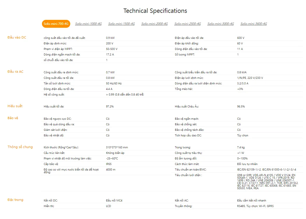 Dòng Inverter 1 Pha Solis-Mini là người dẫn đầu nguồn điện xanh trong các dự án điện mặt trời áp mái nhỏ cho nhà ở và thương mại, giá cả phải chăng. Áp dụng đủ các kĩ thuật điều khiển kĩ thuật số, có cấu trúc topo tiên tiến, và thuật toán MPPT chính xác, có hiệu suất cao hơn hiệu suất thiết bị các hãng dẫn đầu trong nghàng với hiệu suất tối đa 97.5%. Trong khi có tích hợp nhiều tính năng bảo vệ, công nghệ chuyển tần số siêu cao.