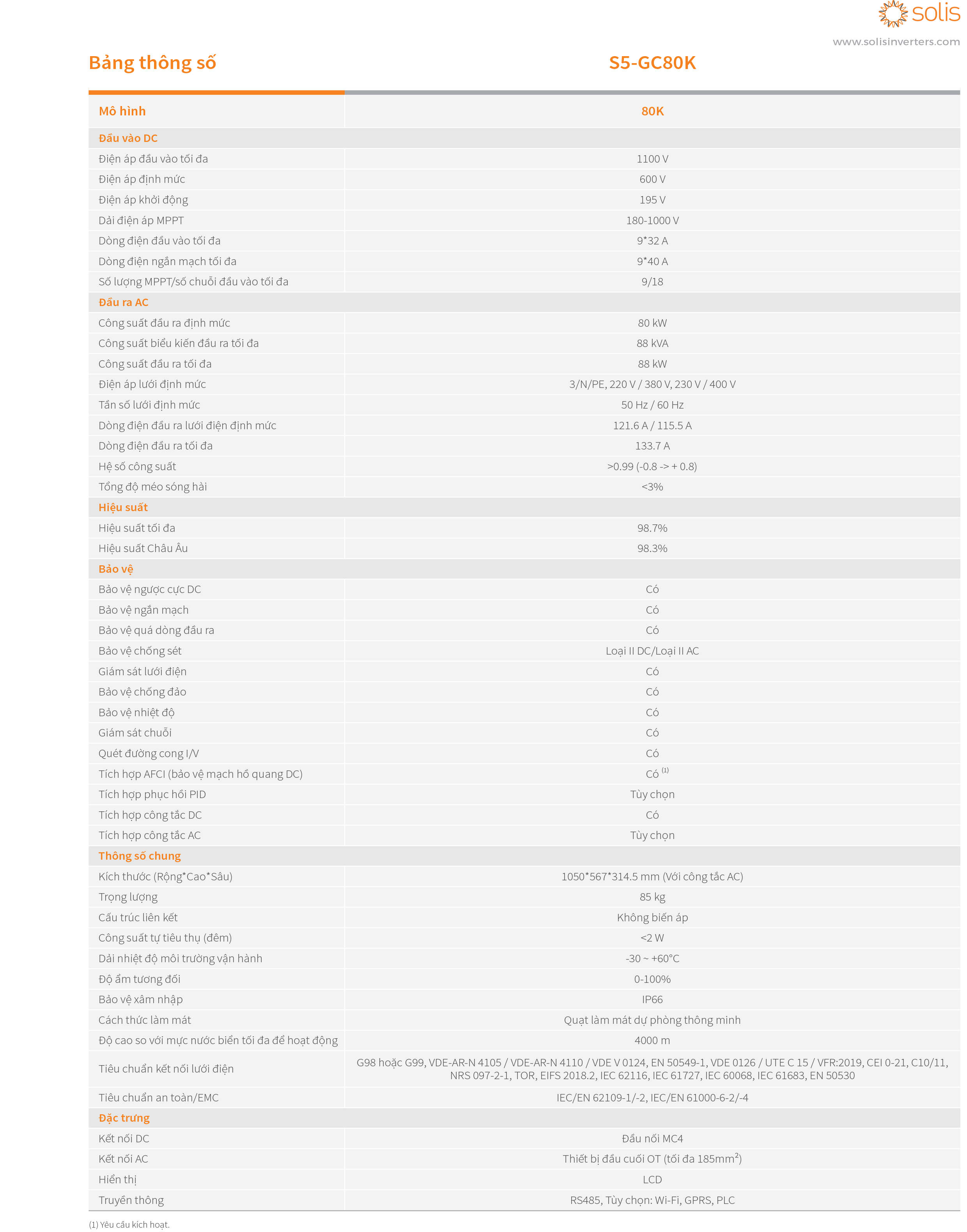 Inverter 3 Pha 80kW được thiết kế 9 MPPT để cung cấp sơ đồ cấu hình linh hoạt hơn với tốc độ tác động môi trường nhỏ hơn và hiệu suất tạo cao hơn. Tối đa 16A mỗi chuỗi, khả năng quá tải 150% đầu vào DC, có chức năng quét đường đặc tính I-V thông minh từ xa & cục bộ