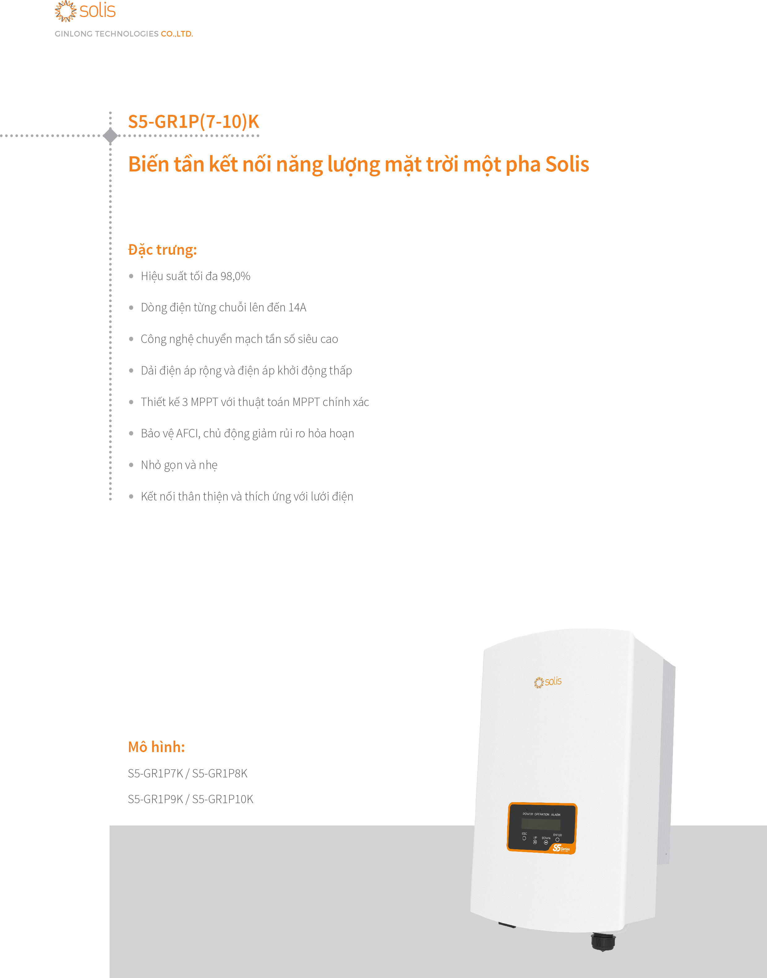 Biến tần S5-GR1P 7K được thiết kế cho các nhà máy điện mặt trời (PV) dân dụng. Thiết kế 3 MPPT có thể làm giảm sự không khớp của chuỗi một các hiệu quả. Thiết kế nhỏ gọn và nhẹ, dễ dàng lắp đặt. Mức bảo vệ được tăng đến IP66. Chức năng AFCI tích hợp có thể chủ động giảm nguy cơ hỏa hoạn.