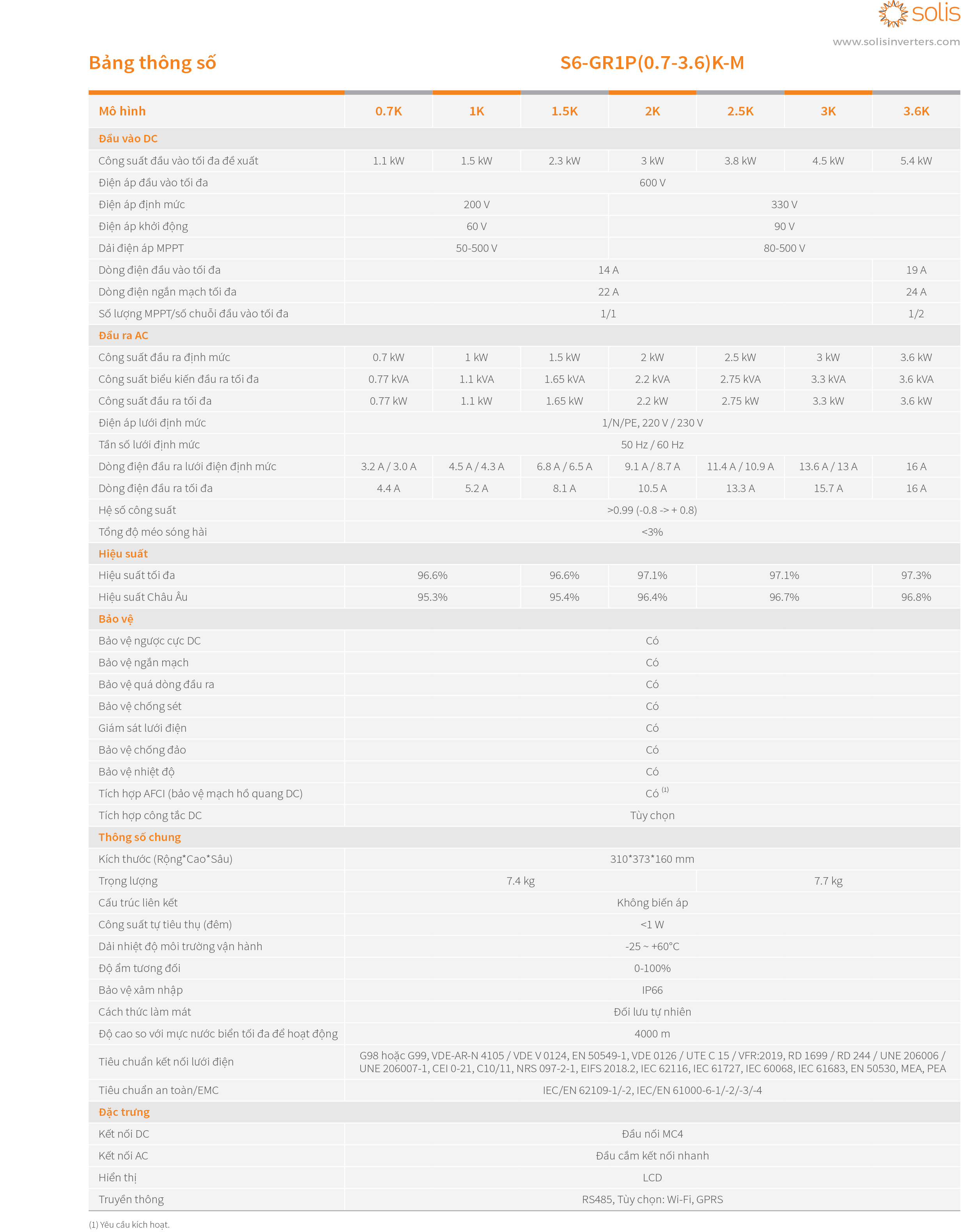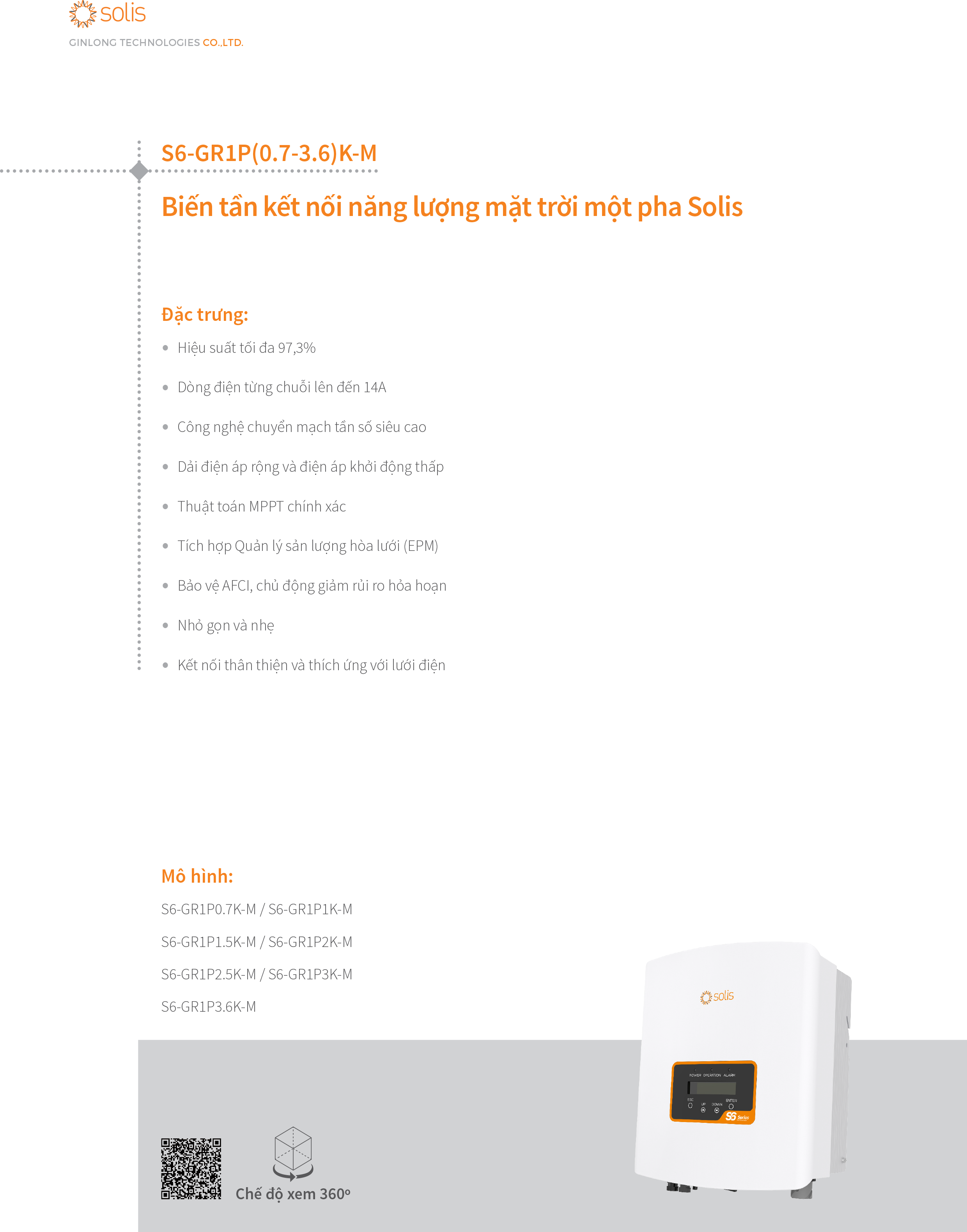 Inverter Solis S6-GR1P 3K-M được thiết kế cho các nhà máy điện mặt trời (PV) dân dụng. Dòng điện đầu vào tối đa trên mỗi chuỗi là 14A, tương thích với các mô-đun hiệu suất cao và mô-đun hai mặt. Thiết kế nhỏ gọn và nhẹ, giúp lắp đặt một cách dễ dàng. Thiết kế không quạt, tiếng ồn thấp hơn, mang đến cho bạn một môi trường sống thoải mái. Chức năng AFCI tích hợp có thể chủ động giảm nguy cơ hỏa hoạn