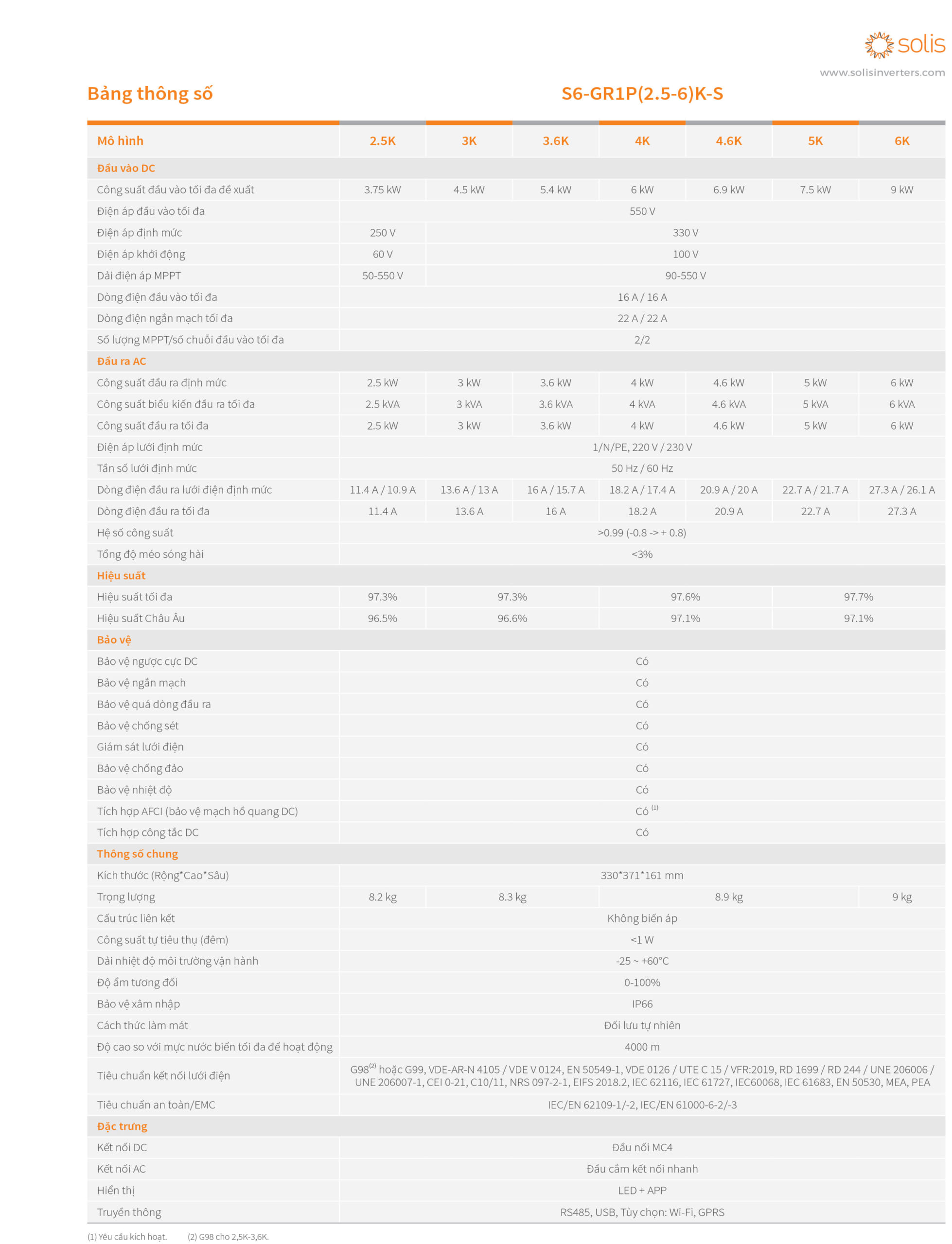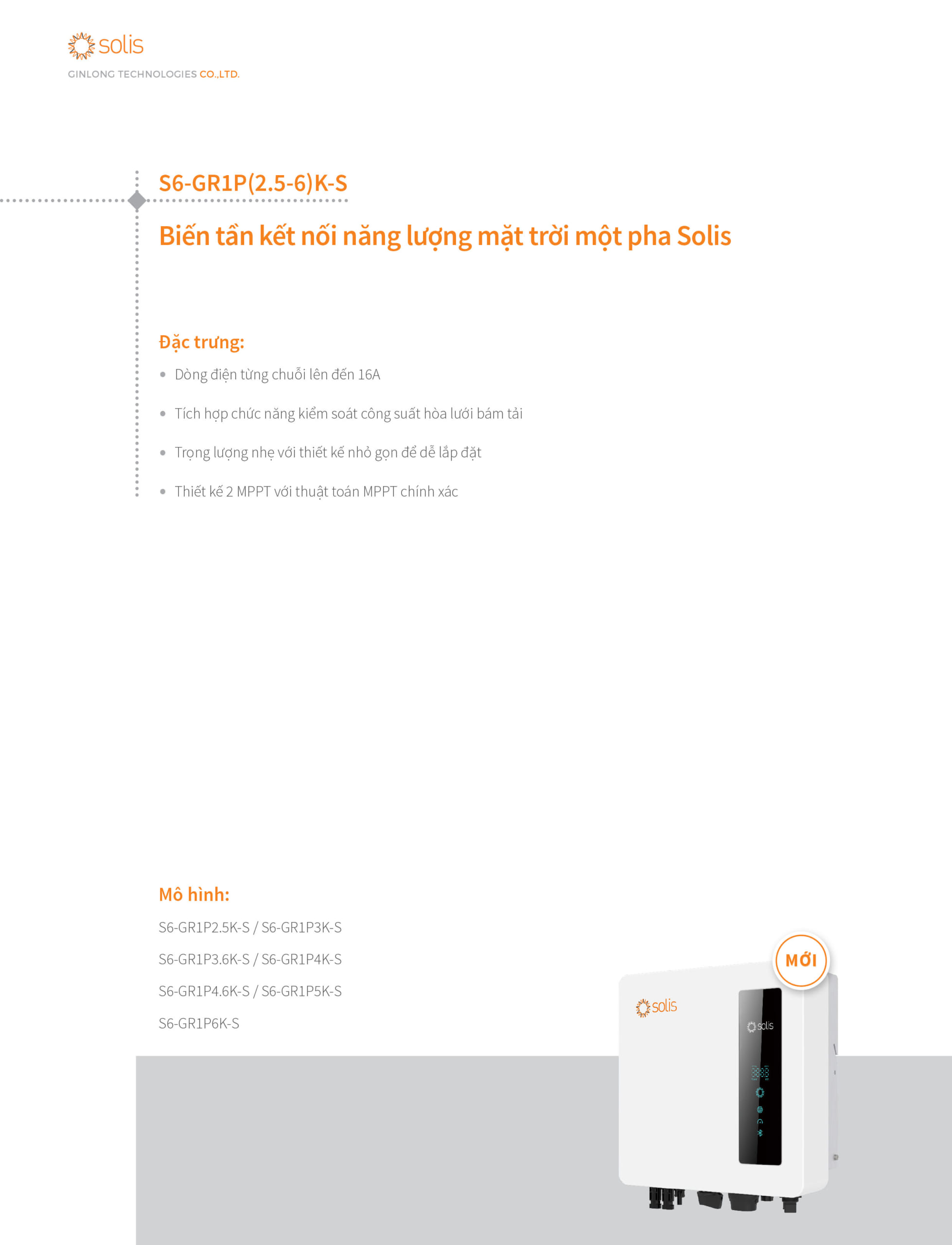 Inverter Solis S6-GR1P 4.6K-S được thiết kế cho các nhà máy điện mặt trời dân dụng. Dòng đầu vào tối đa trên mỗi chuỗi là 16A, tương thích với các mô-đun hiệu suất cao và mô-đun hai chiều. Thiết kế gọn nhẹ giúp dễ dàng lắp đặt. Chỉ số bảo vệ đã tăng lên ở mức IP66. Các chức năng bảo vệ thông minh giúp cung cấp điện gia đình một cách an toàn và bảo đảm.
