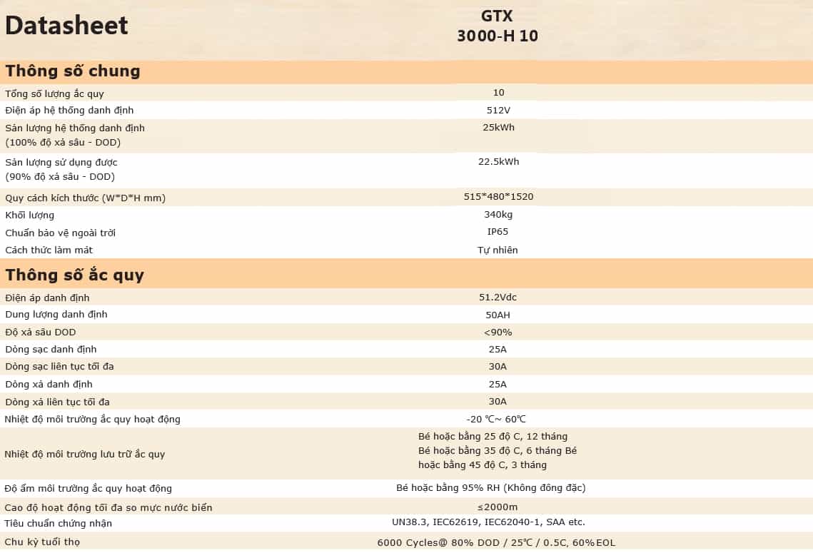 Thông số kỹ thuật Pin lưu trữ Lithium Sofar 25KW (GTX3000-H10) 3pha
