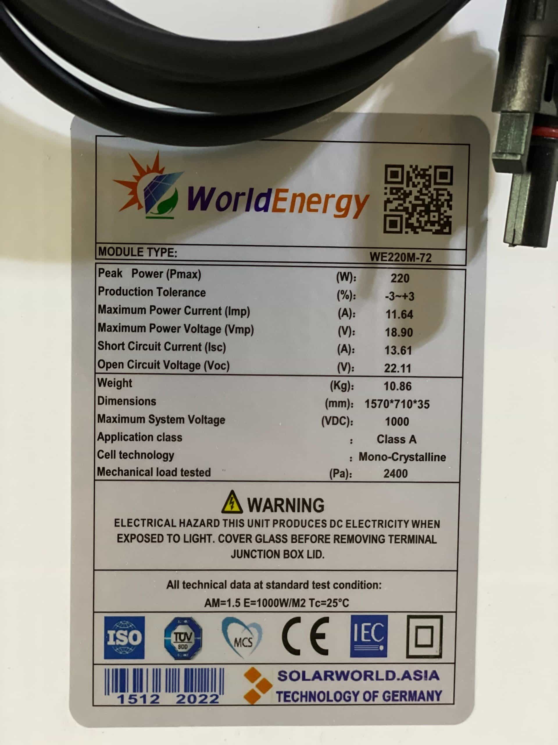 Tấm pin năng lượng mặt trời Mono World Energy 220W – Giải pháp tiết kiệm điện hiệu quả