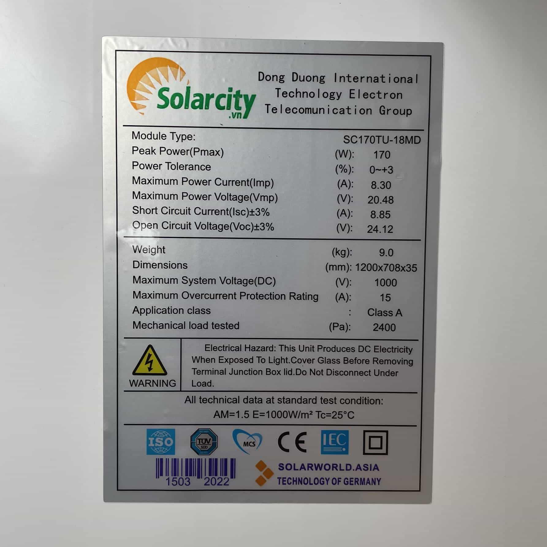 * Thông số kỹ thuật tấm PIN NĂNG LƯỢNG MẶT TRỜI MONO 170W